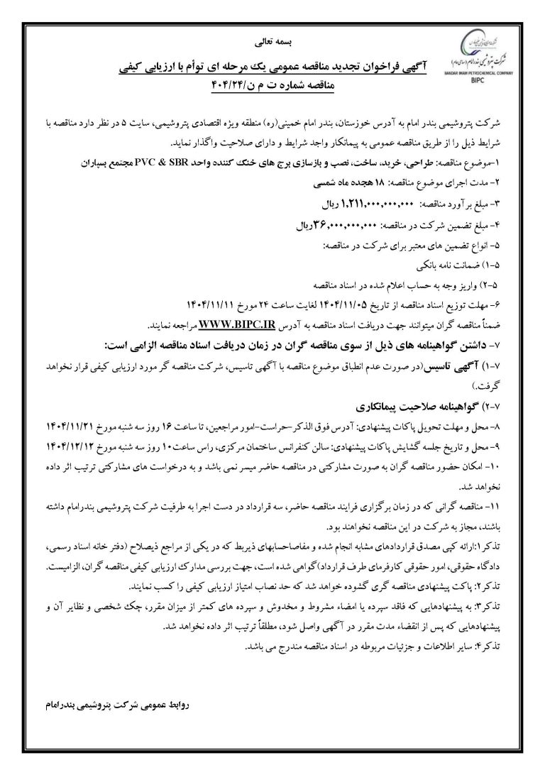 موضوع مناقصه: طراحی، خرید، ساخت، نصب و بازسازی برج های خنک کننده واحد PVC & SBR مجتمع بسپاران
