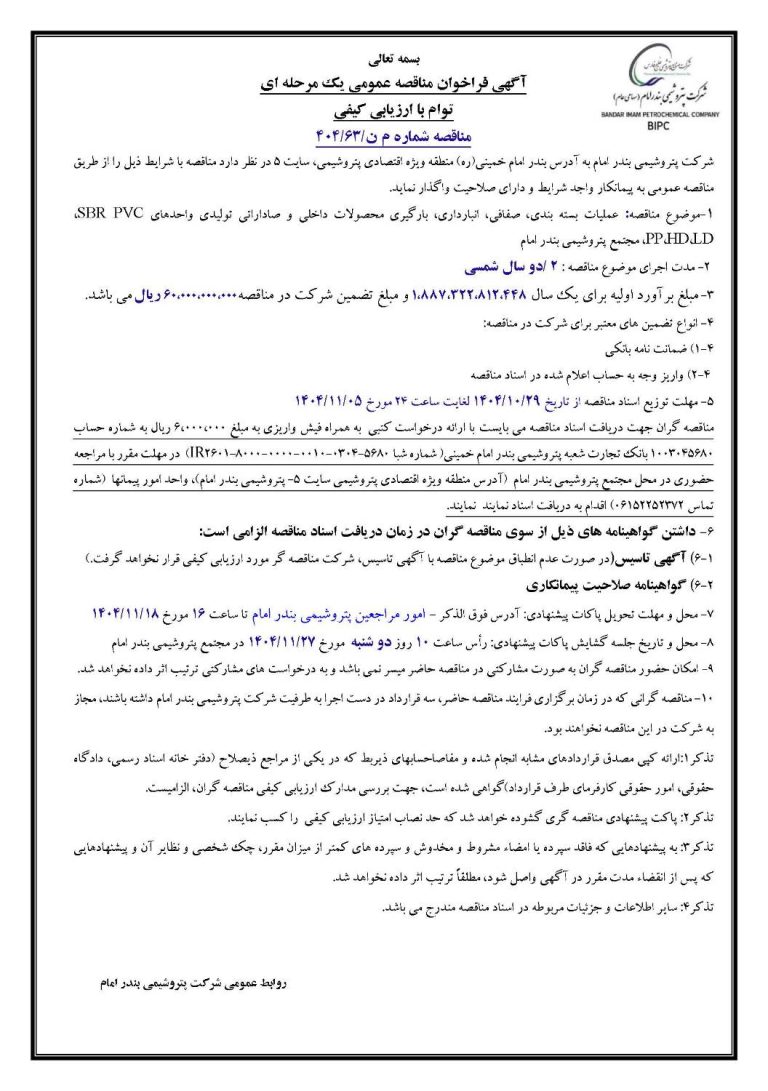 موضوع مناقصه: عملیات بسته بندی، صفافی، انبارداری، بارگیری محصولات داخلی و صاداراتی تولیدی واحدهای SBR PVC، LD،HD،PP، مجتمع پتروشیمی بندر امام