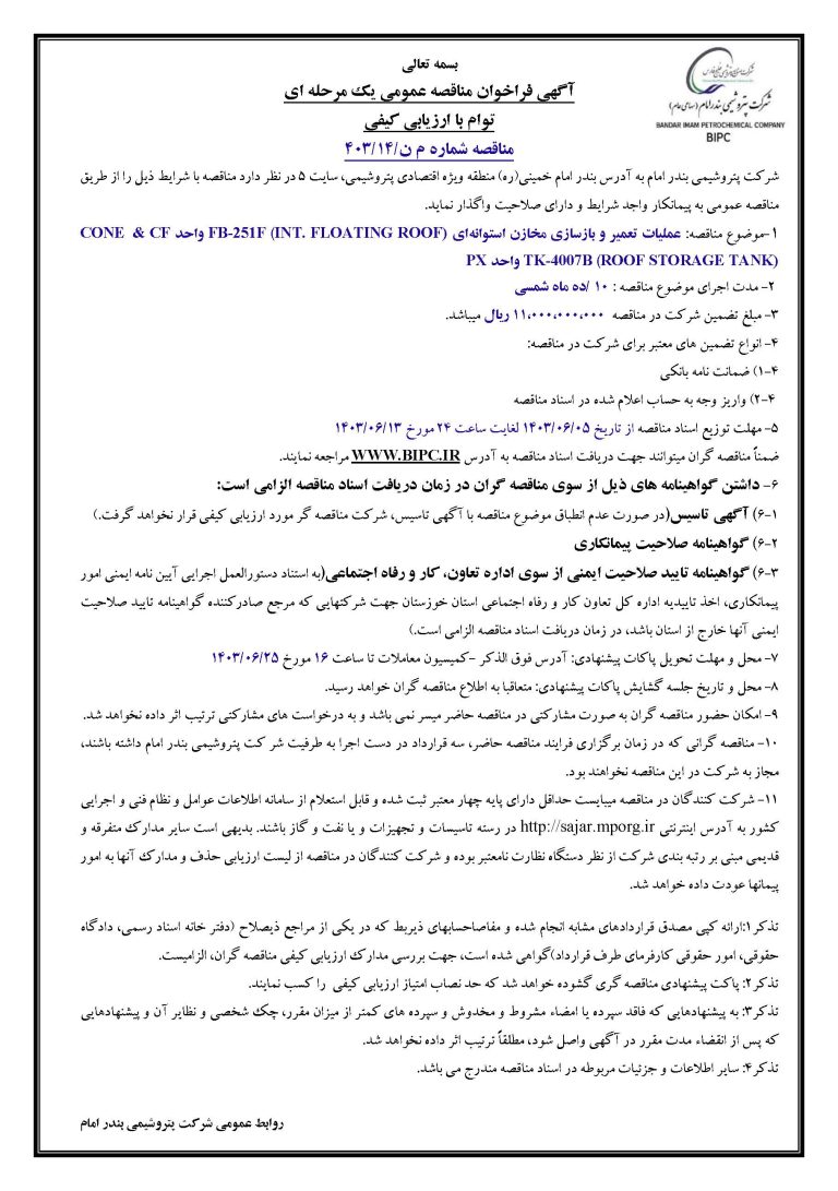 موضوع مناقصه: عملیات تعمیر و بازسازی مخازن استوانه‌ای INT. FLOATING ROOF)) ‌FB-251F واحد CF & CONE ROOF STORAGE TANK)) ‌TK-4007B واحد PX