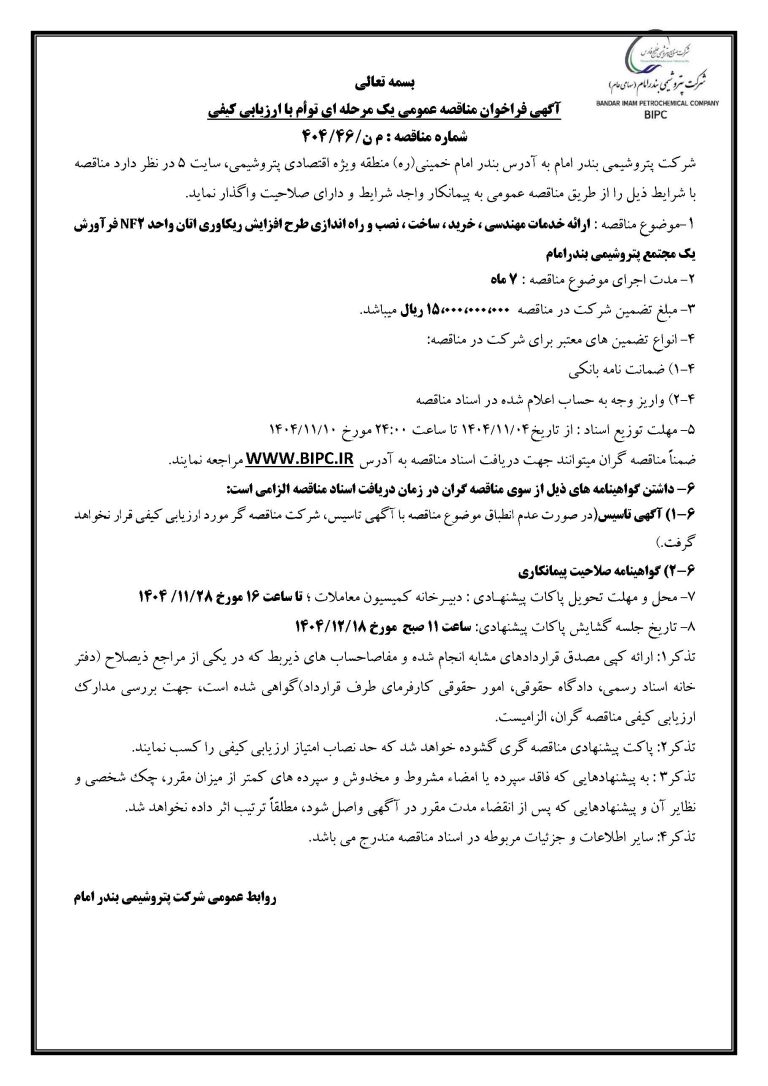 موضوع مناقصه : ارائه خدمات مهندسی ، خرید ، ساخت ، نصب و راه اندازی طرح افزایش ریکاوری اتان واحد NF2 فرآورش یک مجتمع پتروشیمی بندرامام