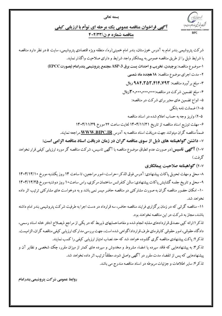موضوع مناقصه: برچیدن، تخریب و احداث پست برق ASP-3 مجتمع پتروشیمی بندرامام (بصورتEPCC)