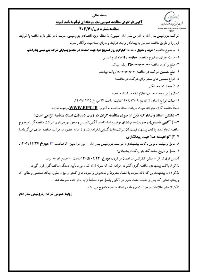 آگهی فراخوان مناقصه عمومی یک مرحله ای توأم با تأیید نمونه