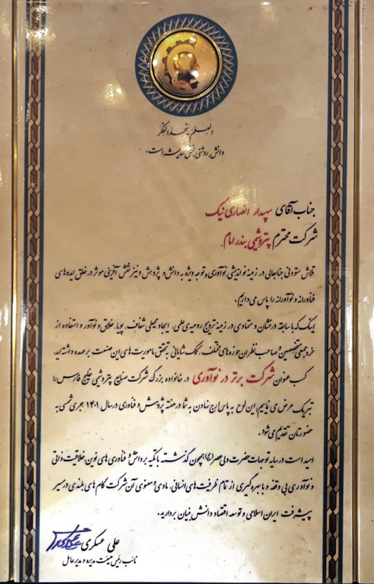 اینک که با سابقهی درخشان و متمادی در زمینه ترویج روحیه علمی، ایجاد محیطی شفاف، پویا، خلاق و نوآور و استفاده از خردجمعی متخصصین و صاحب نظران حوزه های مختلف، کمک شایانی به تحقق ماموریتهای این صنعت برعهده داشتهاید، کسب عنوان «شرکت برتر درنوآوری» در خانوادهی بزرگ شرکت صنایع پتروشیمی خلیج فارس را تبریک عرض مینمائیم؛ این لوح به پاس ارج نهادن به شما در هفتهی پژوهش و فناوری در سال ۱۴۰۱ هجری شمسی به حضورتان تقدیم میشود.