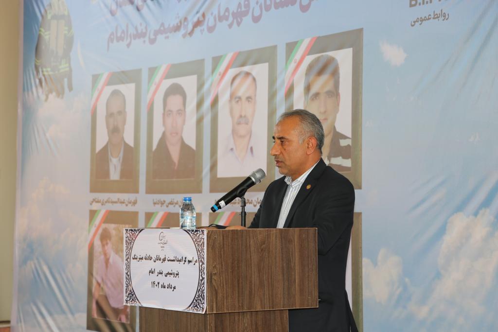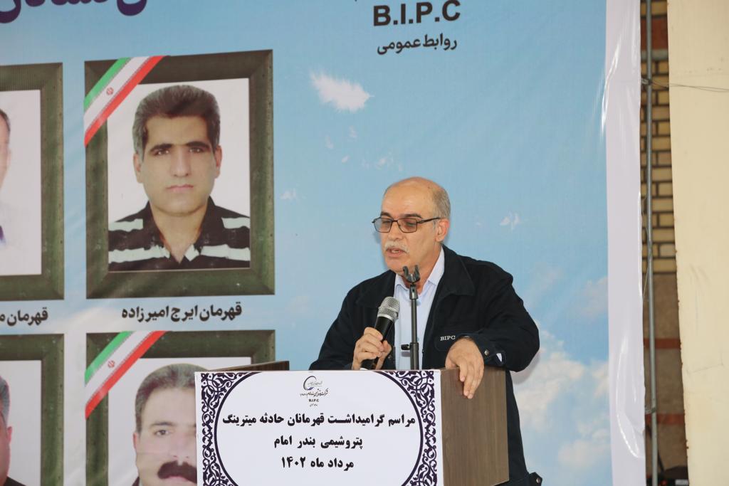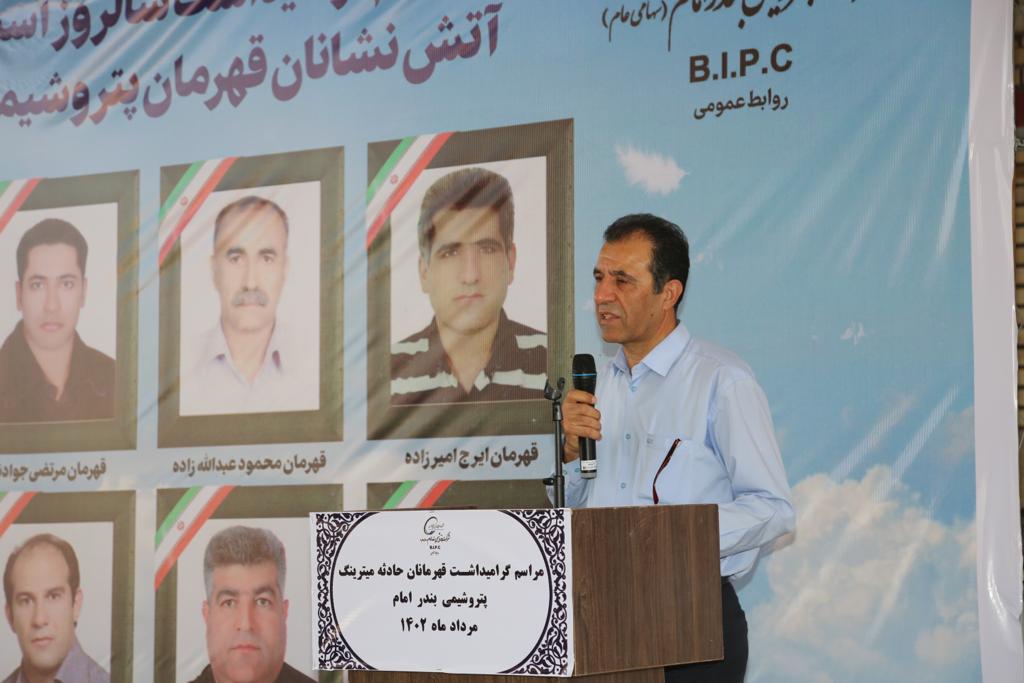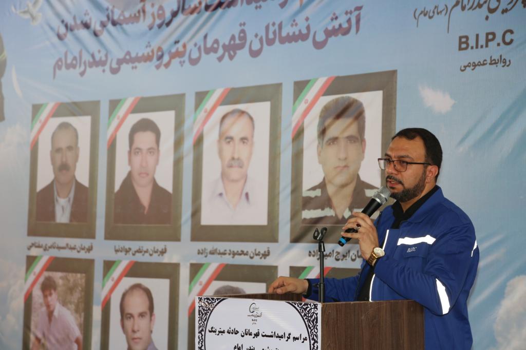 مدیرعامل شرکت پتروشیمی بندرامام ادامه داد: «این مراسم از چند جنبه اهمیت دارد و اولین اهمیت این است که ما به خانواده های داغ دیده این شهدای عزیز که امسال یازدهمین سالگرد گرامیداشت آن است تسلیت بگوییم و در کنار آنان باشیم و به آنان بگوییم ما به شما، یاد شما و کار بزرگ شما متعهد هستیم و یاد شهدا همیشه زنده است.»