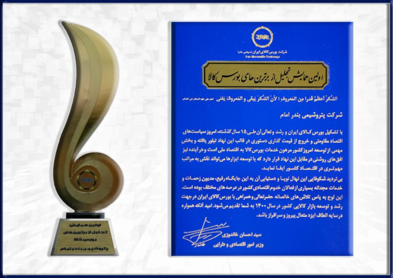در این مراسم پتروشیمی بندرامام از برترین های عرضه کننده بورسی از نظر وزنی و ریالی معرفی و لوح تقدیر و تندیس برترین های بورس کالا به شرکت اعطاء شد.