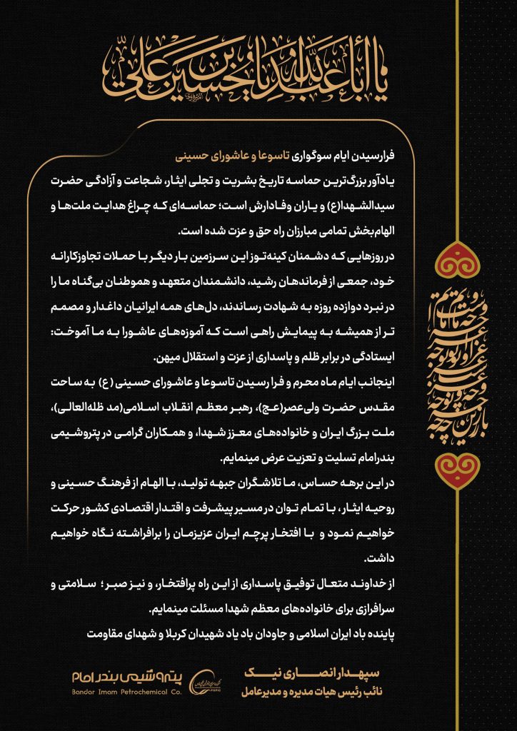 پیام تسلیت مدیرعامل پتروشیمی بندر امام به مناسبت تاسوعا و عاشورای حسینی