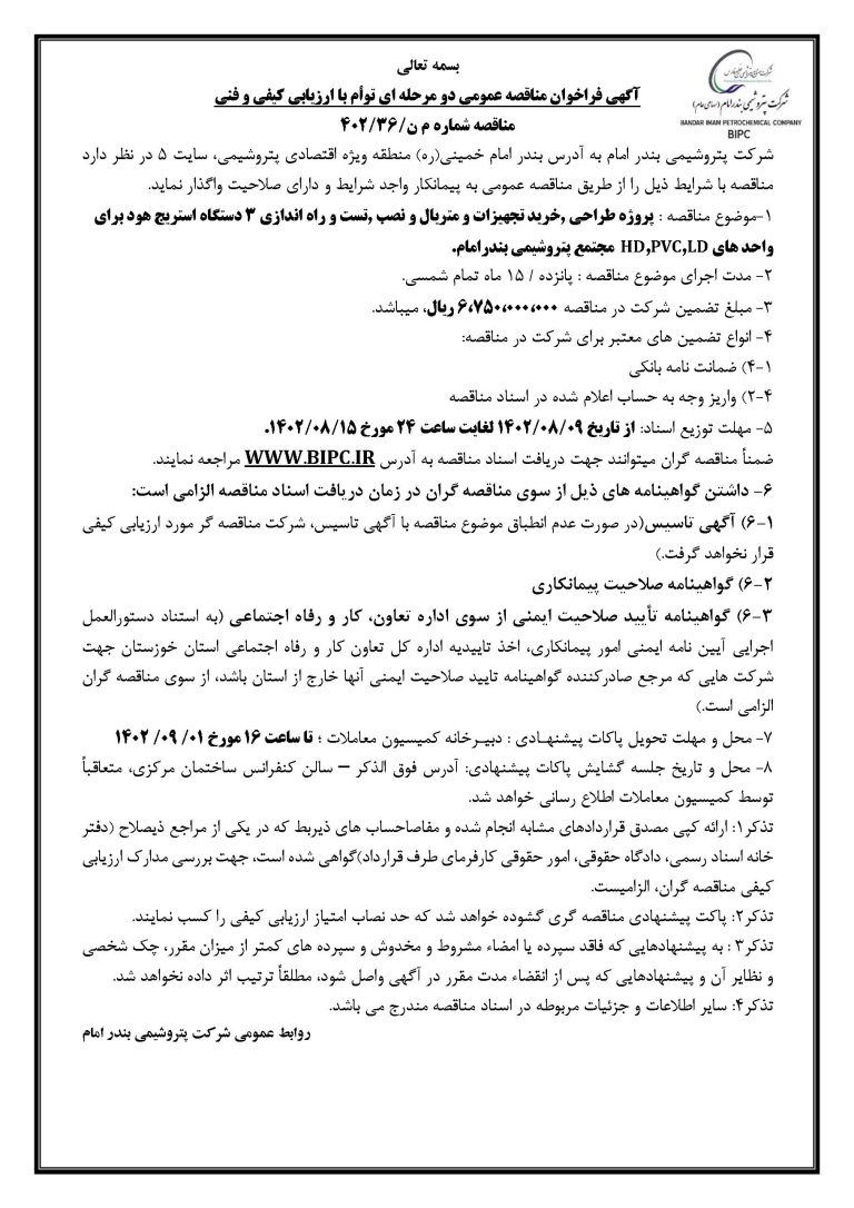 آگهی فراخوان مناقصه عمومی دو مرحله ای توأم با ارزیابی کیفی و فنی